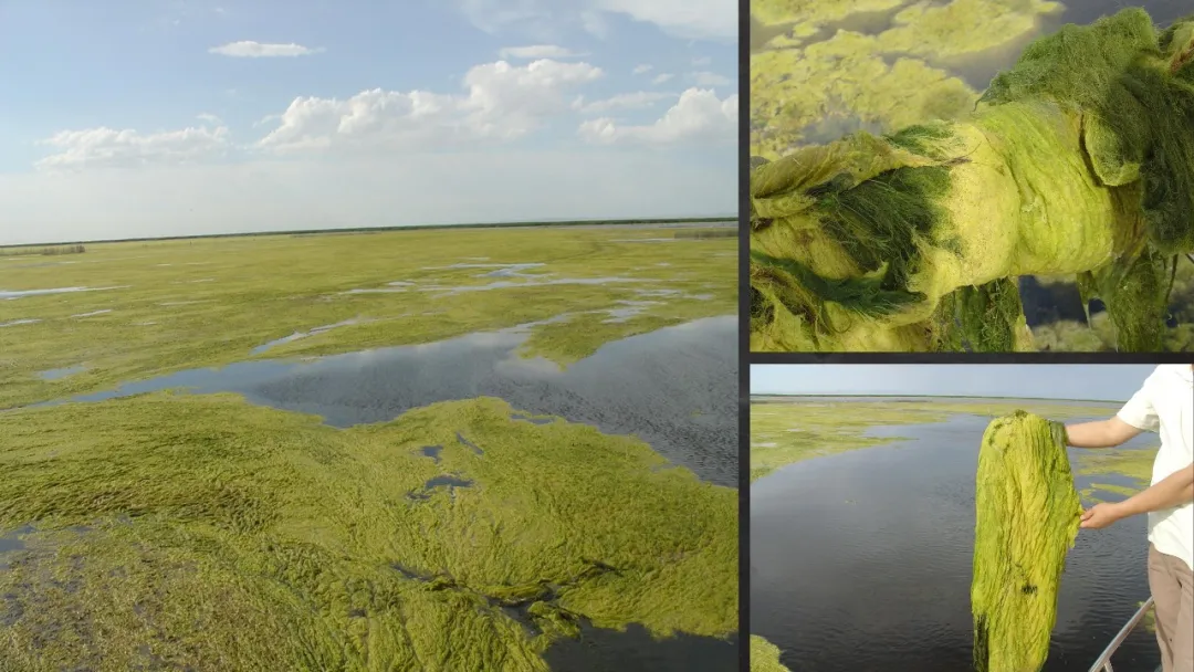 就是這麼一個美麗的湖泊,在2008年、2009年遭到黃苔的污染,黃苔面積鋪滿了整個的湖面,實際上黃苔和藍藻一樣,生長速度極快,一旦它爆發就會給生態系統造成極大的災難。