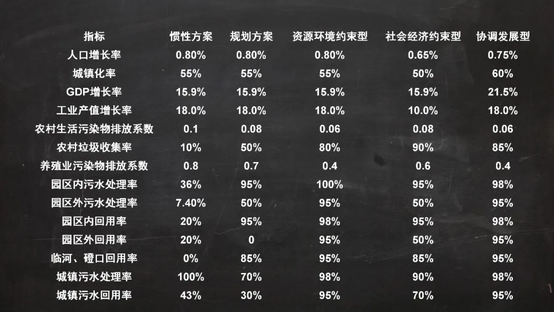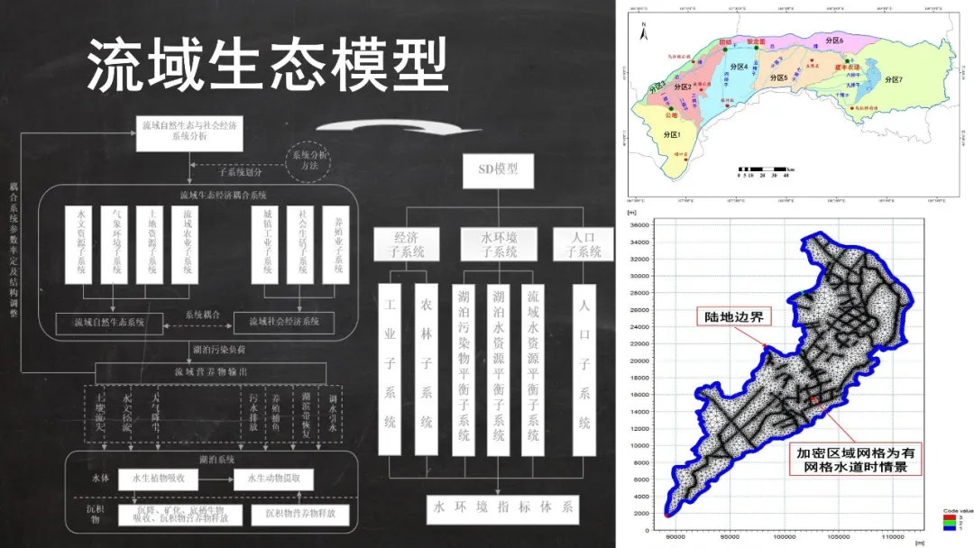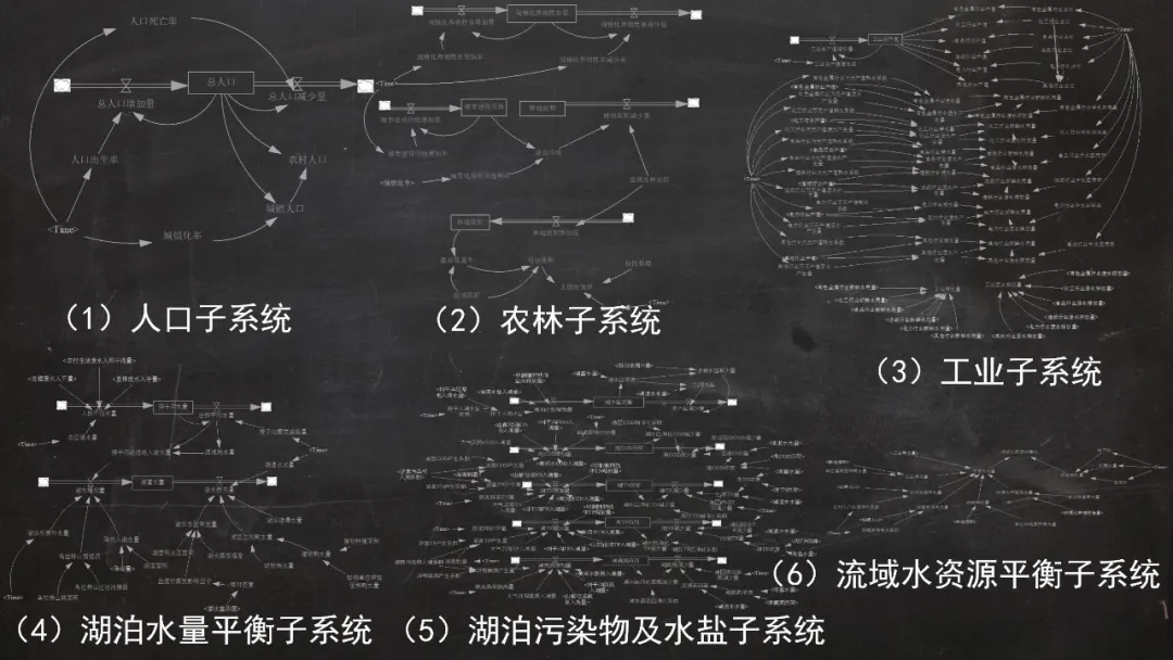 這是我們建立的人口子系統、農林子系統和工業子系統三大經濟系統,下面的這三個,就是我們建立的湖泊水質的響應系統,通過我們的這種模型構建,我們模擬了烏梁素海流域不同的經濟和環境保護的方案,最後我們提出了一套流域的可持續發展方案。