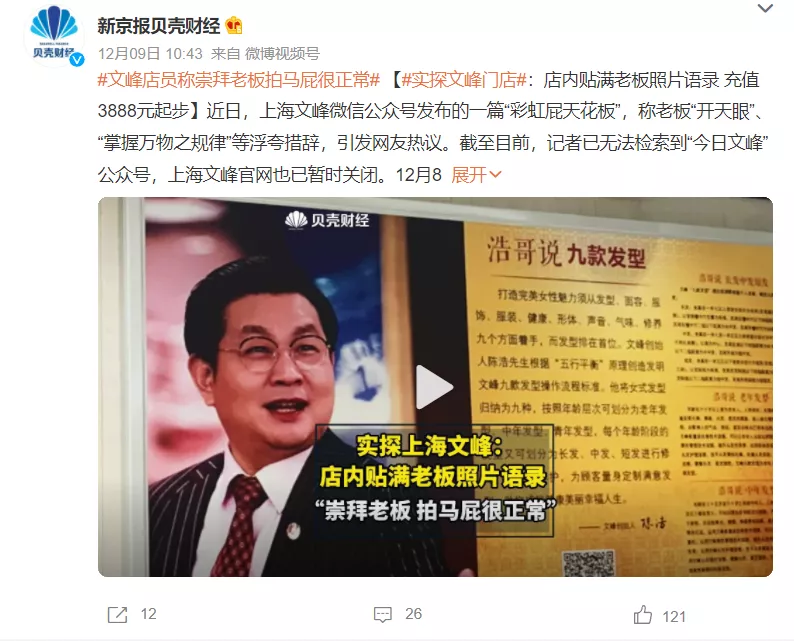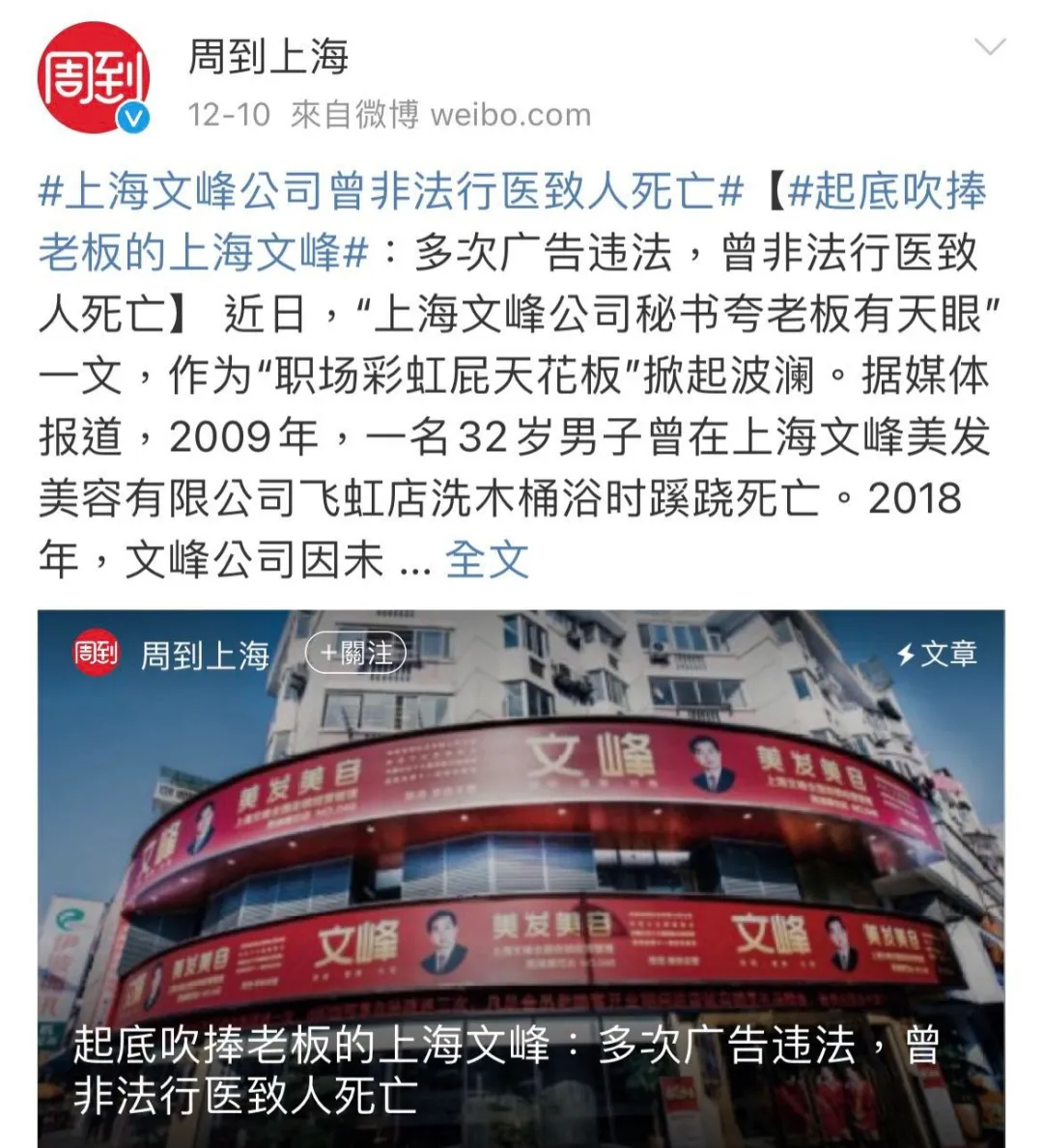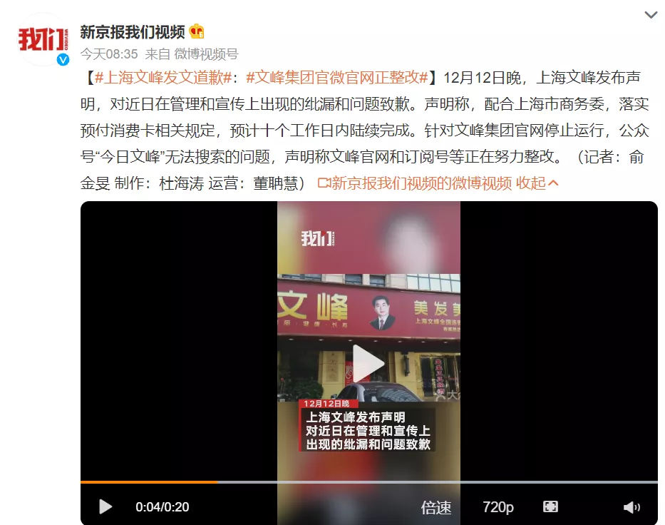 12月12日晚,上海文峯發佈聲明,對管理和宣傳上出現的紕漏和問題致歉,並對文峯官網和訂閲號進行努力整改。