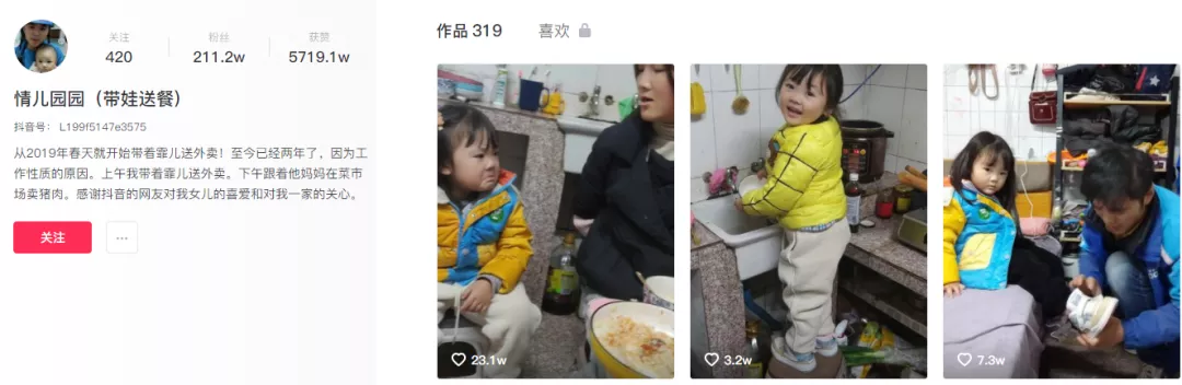 還有那個帶娃送餐的餓了麼外賣小哥,現如今他的女兒已經兩歲了,他依然在拍短視頻,記錄自己一家的小生活。