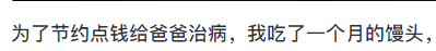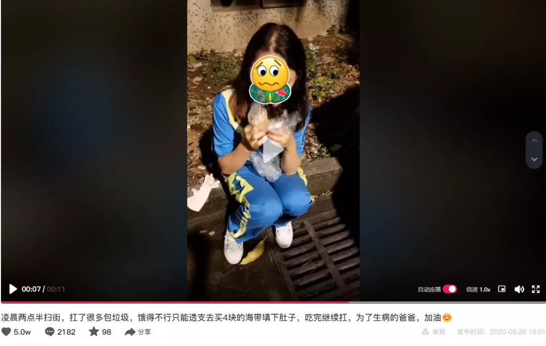 女孩有時候連吃一個月白饅頭,就為了多省點錢給父親治病。有時候覺得疲憊,吐槽家人因為她幹環衞瞧不起她。