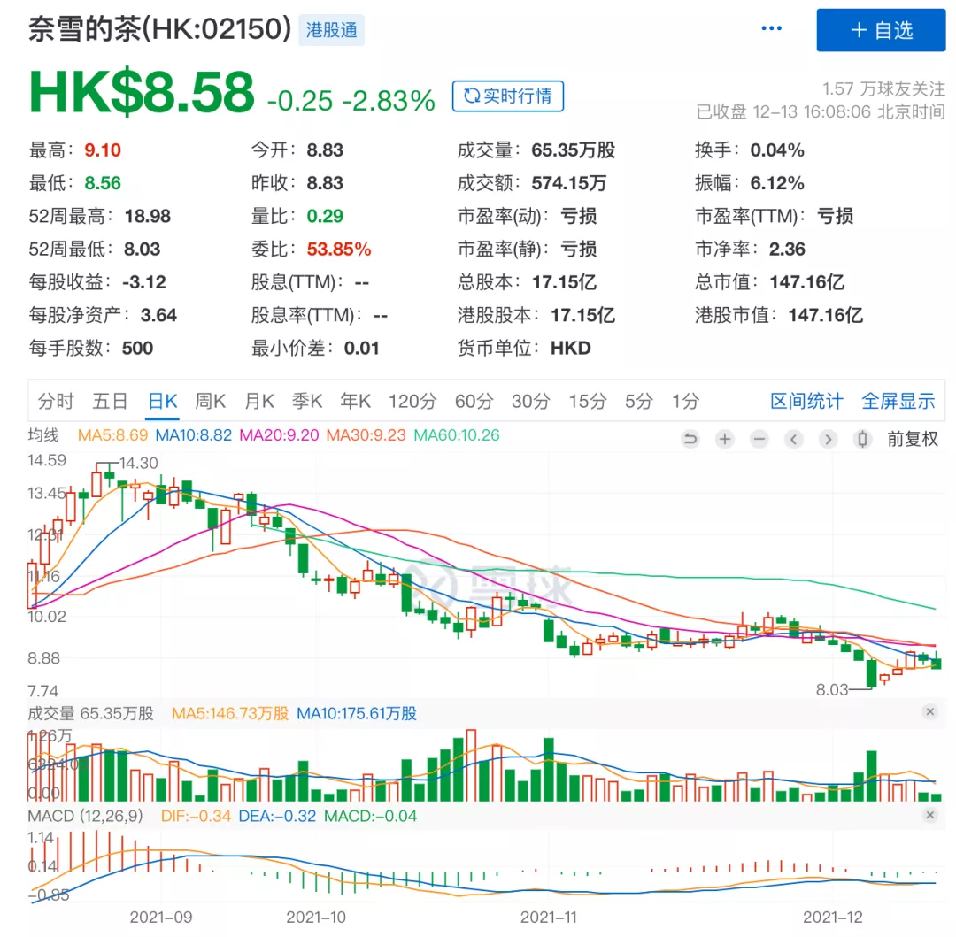 奈雪的茶12月13日收盤後股價,來源:雪球