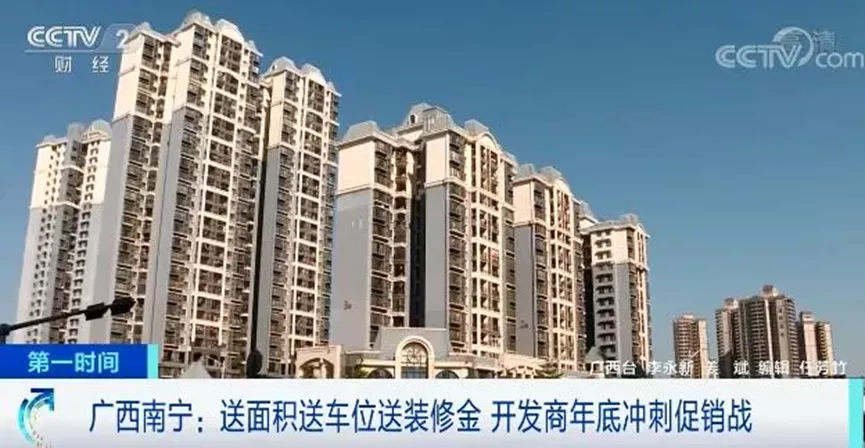 與此同時,據央視財經的報道,南寧有不少樓盤,不僅出現了零首付、房價直降的情況,還推出了買房送車位、送面積、送裝修款甚至返現金的促銷措施。