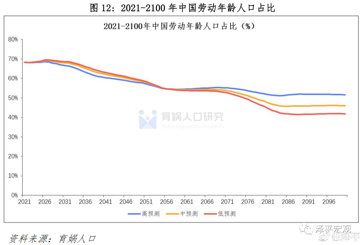 按照中生育率預測,2050年勞動年齡人口占比下降到58.5%,2100年勞動年齡人口占比下降到45.9%。
