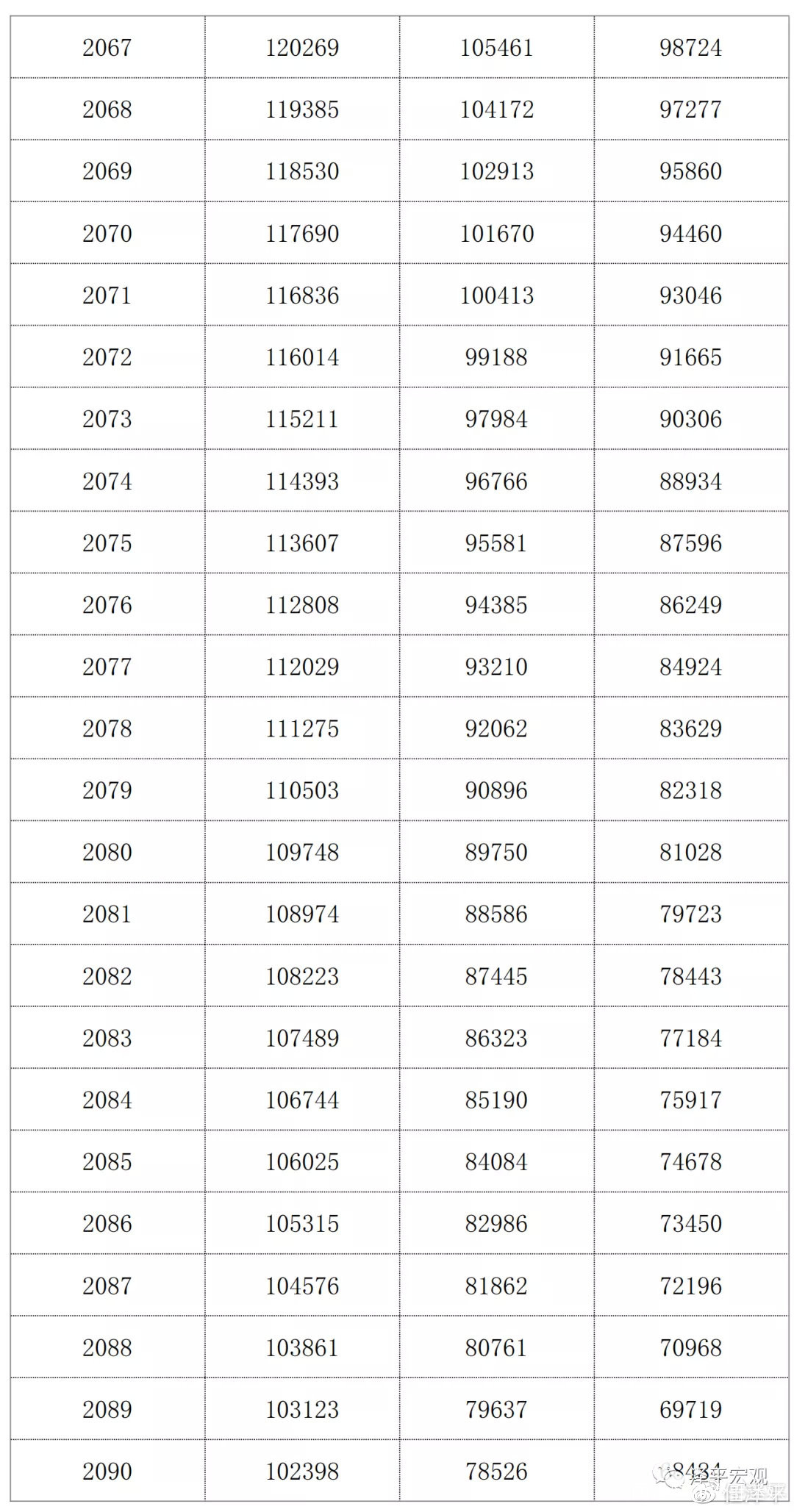 生育模式採用2019年國家統計局抽樣調查得到的生育模式。人均預期壽命為假設壽命逐年緩慢增長,到2050年男80歲,女85歲。並假設出生性別比從2021年起逐年下降,到2030年下降到106的正常值,此後一直保持106。