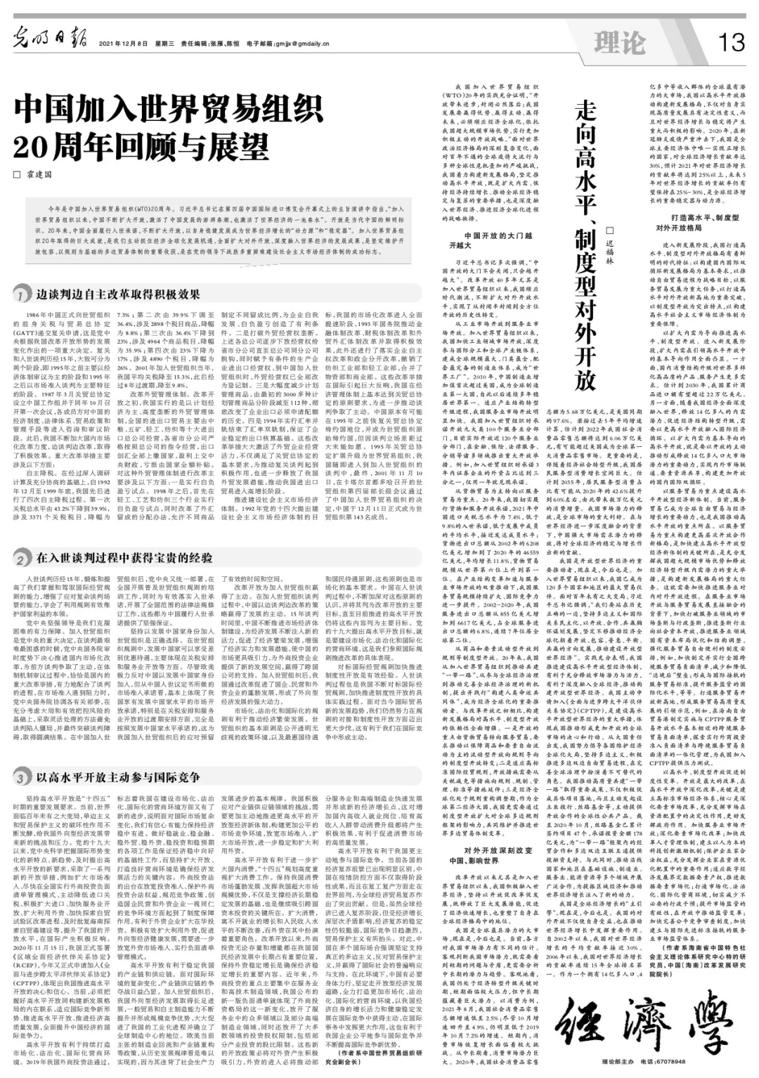 今年是中國加入世界貿易組織(WTO)20週年。習近平總書記在第四屆中國國際進口博覽會開幕式上的主旨演講中指出,“加入世界貿易組織以來,中國不斷擴大開放,激活了中國發展的澎湃春潮,也激活了世界經濟的一池春水”。開放是當代中國的鮮明標識。20年來,中國全面履行入世承諾,不斷擴大開放,以自身穩健發展成為世界經濟增長的“動力源”和“穩定器”。加入世界貿易組織20年取得的巨大成就,是我們主動抓住經濟全球化發展機遇、全面擴大對外開放、深度融入世界經濟的發展成果,是堅定維護開放包容、以規則為基礎的多邊貿易體制的重要收穫,是在黨的領導下戰勝多重困難建設社會主義市場經濟體制的成功標誌。