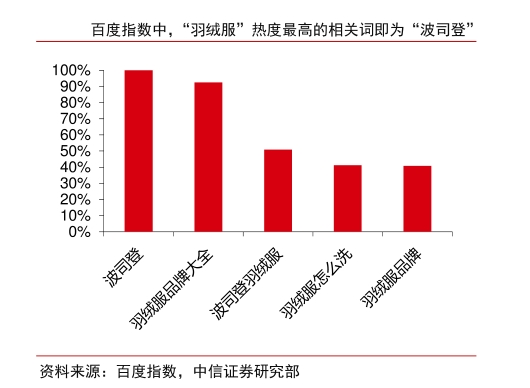 保暖性能要求的技術壁壘催生了行業集中度較高的國產羽絨服賽道。根據中國服裝協會數據,行業前十大品牌較為穩定,44%的CR10(行業排名前十的企業合計市佔率)僅次於運動類服裝,高於男裝的19%和女裝的10%。**中信證券分析師認為,一旦成熟品牌紮根消費者心智,將具有寬闊的品牌護城河,從而穩固市佔率。**消費市場上將羽絨服與波司登劃上等號的勢頭就是證據之一。
