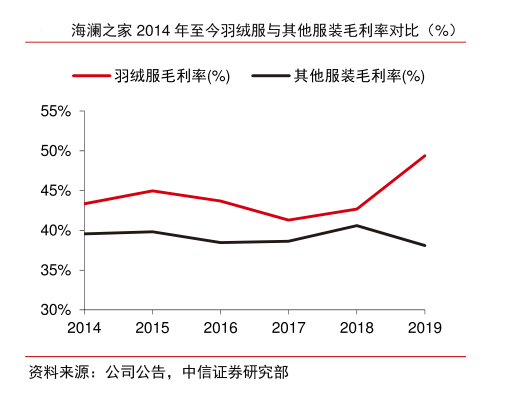 **不難看出,哪怕與公認高毛利的女裝業務相比,羽絨服的毛利率也不遑多讓,而從毛利率增長的勢頭來看,羽絨服產品的想象空間還有可能大於女裝產品。**這個結論在其他公司身上同樣適用,根據中信證券研報,自海瀾之家進入羽絨服市場以來,羽絨服業務毛利率平均為44%,始終高於公司其他品類。所以,這也是四季品牌覬覦羽絨服賽道的根本原因。
