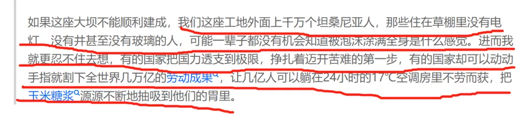 “如果這座大壩不能順利建成,我們這座工地外面上千萬個坦桑尼亞人,那些住在草棚裏沒有電燈、沒有井甚至沒有玻璃的人,可能一輩子都沒有機會知道被泡沫塗滿全身是什麼感覺。進而我就更忍不住去想,有的國家把國力透支到極限,掙扎着邁開苦難的第一步,有的國家卻可以動動手指就割下全世界幾萬億的勞動成果,讓幾億人可以躺在24小時的17℃空調房裏不勞而獲,把玉米糖漿源源不斷地抽吸到他們的胃裏。”