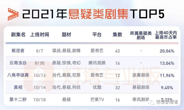 燈塔數據顯示,**截至今年11月21日,劇集市場共上線懸疑類作品數量達92部,類似市佔率為9.31%,僅次於愛情、古裝、劇情、都市四大類型。**而從目前市場懸疑劇佈局來看,除去各大平台都在積極佈局“廠牌”(劇場)外,成分散狀播出的作品,依舊佔據過半,這意味着懸疑劇並非只屬於“平台”獨有,衞視或衞視、平台合作,依舊是一個常態。