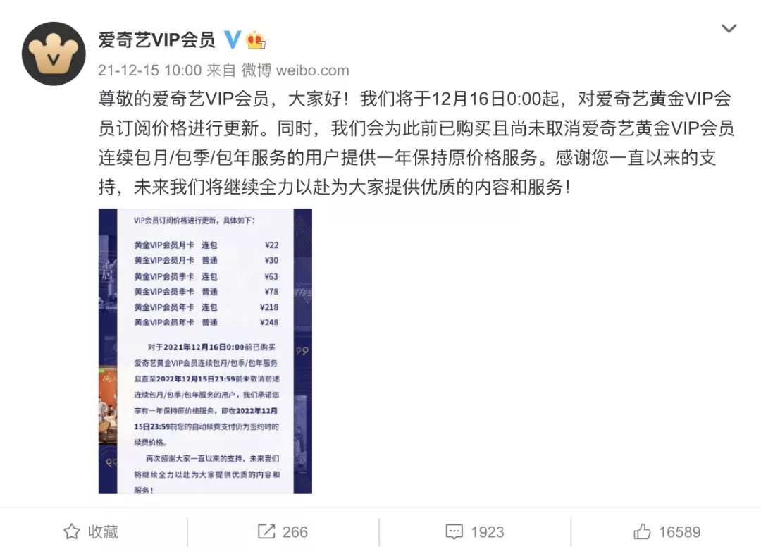 愛奇藝黃金VIP會員訂閲價格又要漲價了。