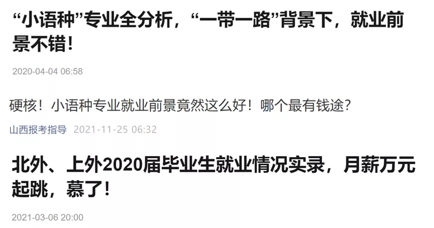 在很多語言類公眾號和報專業老師的眼中,小語種都是香餑餑,幾乎是競爭小、專業稀缺、高就業率和高薪、高大上工作單位的代表。類似的言論在高考報志願期間和國考報名期間屢見不鮮。