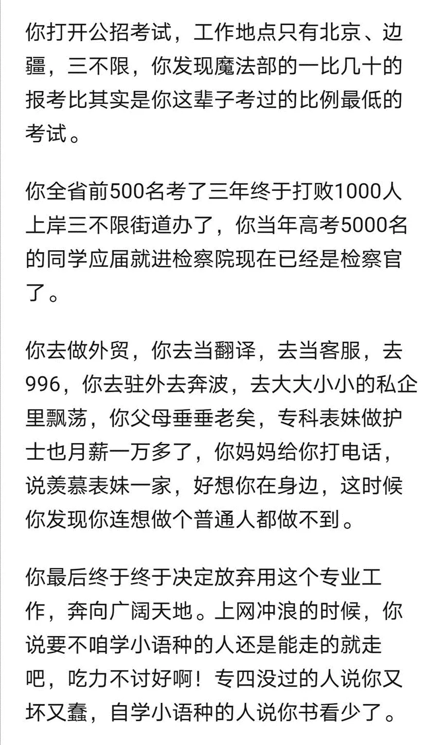 要知道,這一行的鄙視鏈基本是,二本師範能進公立學校考編→小語種高中老師大部分不帶編制→老師吹捧小語種高中老師是好工作→小語種就業不如二本師範。