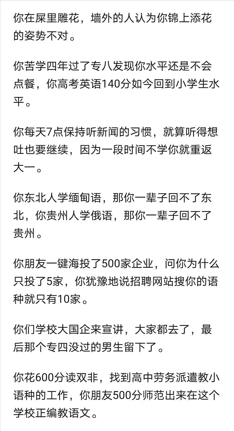 甚至往往,小語種專業學得越好的學生,在畢業時更傾向於找專業相關工作,幾年後發現專業學得不好、一畢業就改行的同學卻混得風生水起。