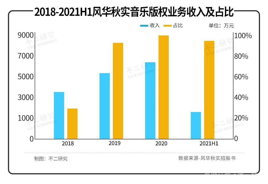 2018—2021年上半年,風華秋實的音樂版權許可及錄製收入分別為3044.4萬元、5056萬元、6876.5萬元和1405.3萬元,同比連增的態勢在2021年上半年中斷;佔總營收比重分別為30.3%、90.9%、97.5%和92.1%,2018年較低的原因是當年演唱會主辦及製作以6073.7萬元的營收貢獻,貢獻了高達60.5%的比重。