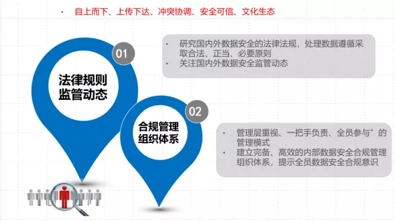 另外一方面,數據安全合規體系的構建是上傳下達。數據安全非常複雜,真正有效的落地需要所有的業務部門和合規、IT一起互動,合規制度能不能有效的通過一線業務部門的人員真正落地,保證上傳下達的通暢機制,這是企業構建數據安全合規體系的時候需要認真考慮的。