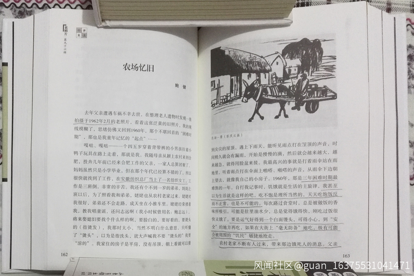 嘎噠、嘎噠—— 一個四五歲穿着揹帶褲的小男孩拉着小鴨子玩具在路上走着,那就是我。我隨母親從潁上農村來到合肥,投奔幾年前已經來合肥工作的父親,一家人總算團聚了(他父親當時在合肥市的市委黨校工作,此文的結尾寫明瞭這一點。——樓主附註)。媽媽雖然只是小學畢業,但在那個年代已經算不錯的了,所以很快就找到了工作,在安徽紡織總廠當上了一名紡織女工,工作是三班倒,非常的辛苦。我還有個不到一歲的弟弟,媽媽上班以後,為了照看我和弟弟,姥姥也從農村老家過來。姥姥對我很好,弟弟還不會走路,成天坐在小推車裏。姥姥經常摟着我,教我唱童謠,還問志遠啊(我小時候曾用名:鮑志遠),將來娶媳婦要找個什麼樣的啊,要臉白的,要好看的,要燙頭的(指燙髮),我那時太小,還不明白什麼意思,只聽懂了“燙頭”,以為是指洗頭,就大聲喊我不要“燙頭的”我要“涼的”。我們住的地方叫陳老崗,就是現在的“和平廣場”東邊那一片(樓主附註:《老照片》刊登此文時刪掉了這半句作者對自己當年的住房的位置的描述,但作者的博客刊登此文時是有這半句的:http://baojianc1.blog.163.com/blog/static/24123200320149168488974/),住的房子是簡陋的平房,沒有吊頂,朝上看就可以看到尖尖的屋頂。遇上下雨天,能聽見雨點打在屋頂的聲音,時間稍久就會有漏雨,開始是慢慢的滴,然後就會越來越大,越來越急,就得用臉盆來接。我最高興的事就是打着雨傘站在雨地裏,聽着雨點打在傘面上啪嗒、啪嗒的聲音,從雨傘下邊朝上望去,就像我自己的小房子。1960年,那是三年困難時期最難熬的一年。自打我記事時,飢餓就是生活的主旋律,**我甚至以為生活就是這樣的吧,吃不飽是理所當然的,天天吃飽飯反而不正常,也是不可能的。**每次路過食堂時,總是被做飯的香味所吸引。可能是肚裏油水少,就是覺得餓得快,剛吃過飯很快又餓了。媽媽上夜班會帶回來一個饅頭,那是廠裏給夜班工人發的“夜宵”,媽媽捨不得吃帶回來給我。白麪饅頭很難得,可得小心,到“安全”的地方再吃,如果在大街上“毫無防備”地吃,極有可能會被周圍的“饑民”敏捷地搶走。