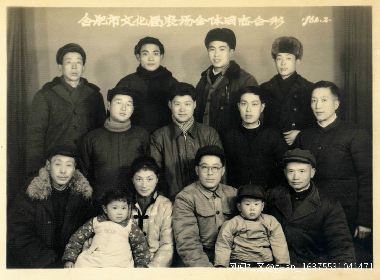 到了合肥城已是傍晚時分,大家提議先去照個相,於是來到三牌樓附近的東風照相館,……於是就留下了這張珍貴的照片。照片中最後一排最右邊戴毛帽子的就是我父親,照片中唯一的小男孩就是我,抱着我的靠中間的那位是楊經理,挨着他的是他夫人和女兒,楊經理夫人和女兒並不在農場,她們是聽到我們返城消息來迎接我們,並參加合影的。……