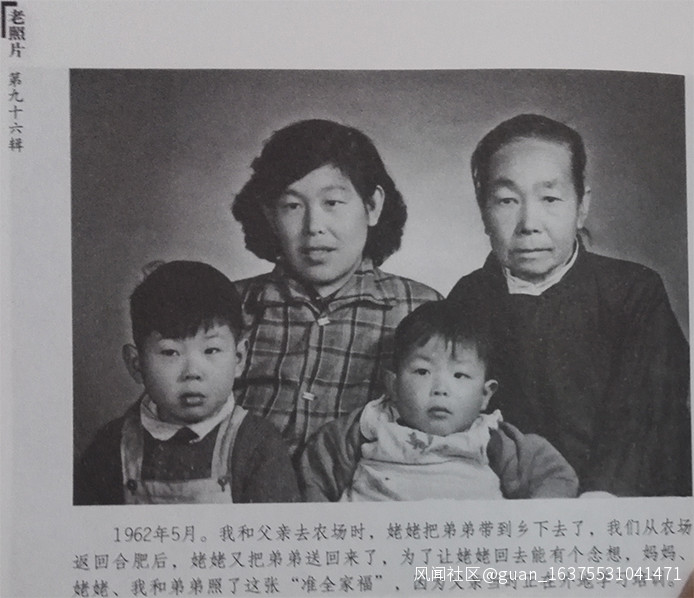 1962年5月。我和父親去農場時,姥姥把弟弟帶到鄉下去了,我們從農場返回合肥後,姥姥又把弟弟送回來了,為了讓姥姥回去能有個念想,媽媽、姥姥、我和弟弟照了這張“準全家福”,因為父親當時正在外地學習、培訓。
