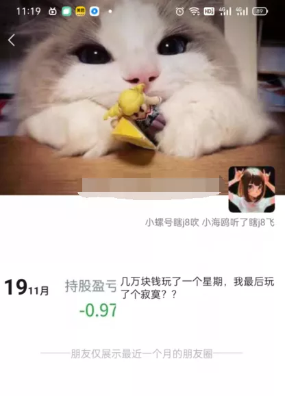 一個商業聯繫的微信,朋友圈背景是布偶貓貓圖,頭像是二次元萌娘,個性簽名是一句騷話,發在11月的朋友圈是玩票虧錢了。