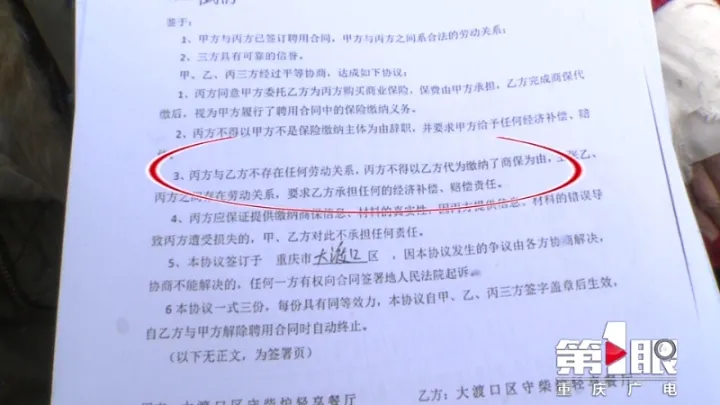 那麼,烤鴨店為什麼敢這麼無視盧女士的權益呢?記者調查發現,盧女士和烤鴨店分別簽了一份勞動聘用合同和商業保險的三方合同,商業保險合同中,有條款約定:盧女士與烤鴨店之間不存在勞動關係,也不可以向烤鴨店提出任何賠償要求。