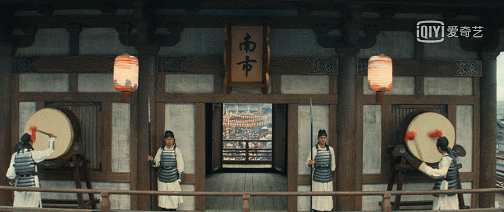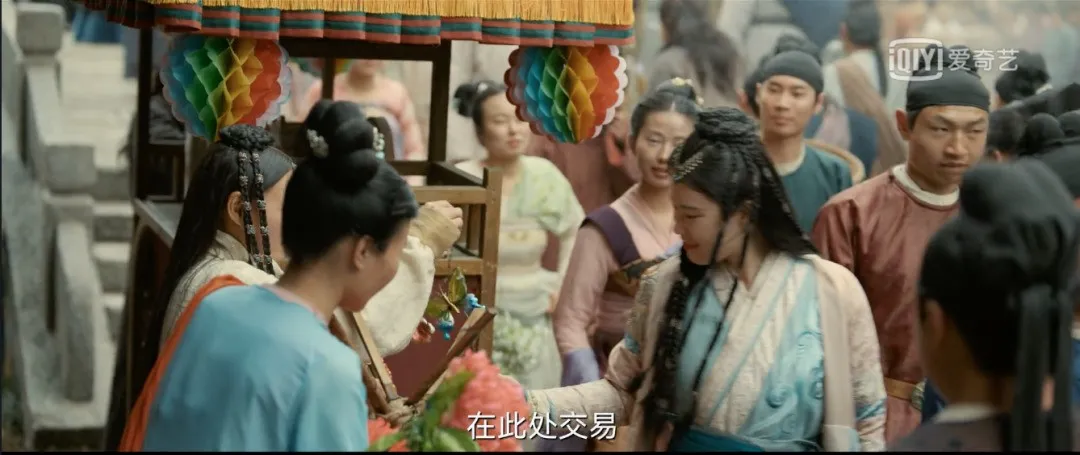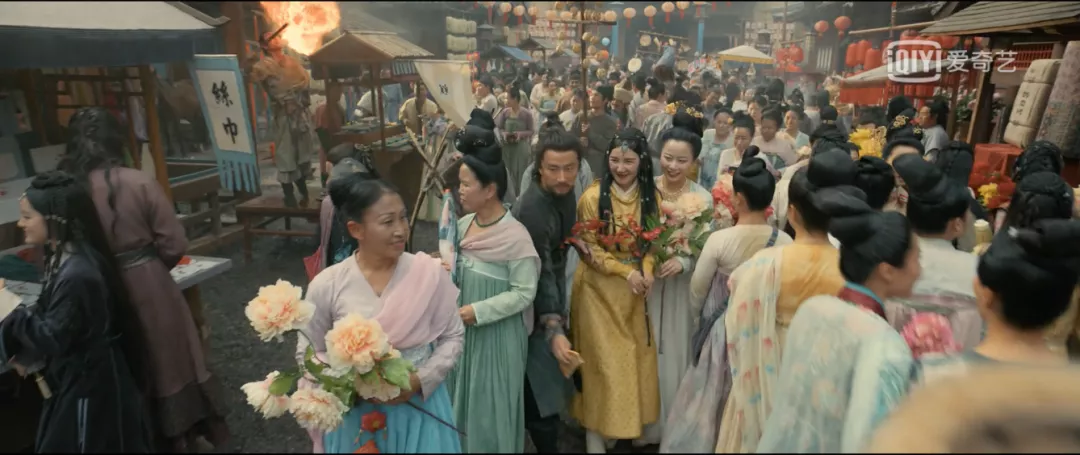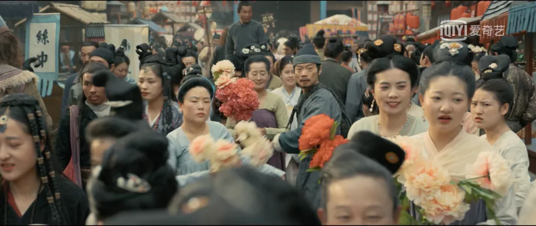 在眾多人物出場的市集裏,場面調度十分複雜,但羣演的服飾也一絲不苟,女性都穿着圓領袍和衫裙,大都有披帛在身,也與窈孃的造型保持一致。
