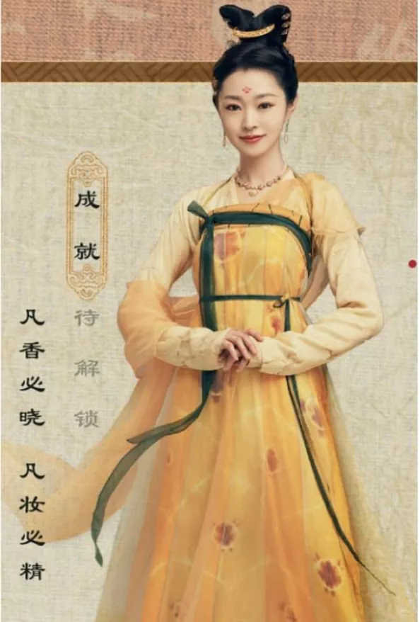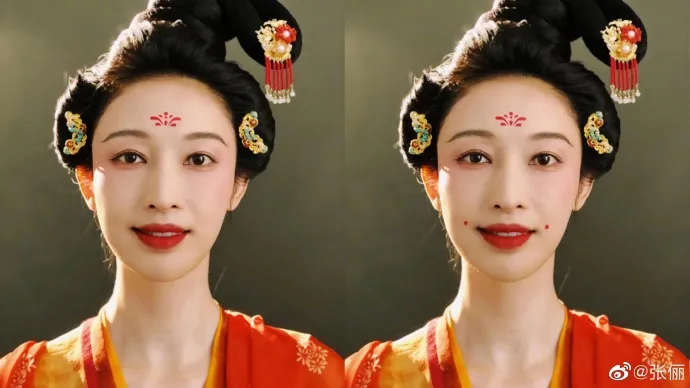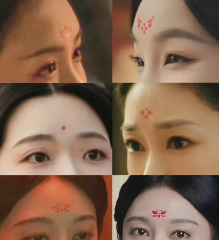 不同女性角色的花鈿花紋也有所不同,柳然額頭上花開四瓣,端莊秀氣,是為梅花妝;侍女芸芝額頭是一個紅圓點,更顯嬌憨可愛;而其他幾人的花鈿則更張揚嬌豔,尤其是永川郡主的。不得不感嘆,《風起洛陽》的造型團隊下足了功夫!