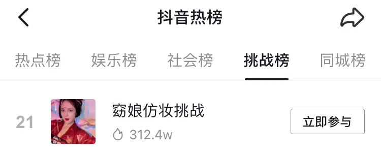 在短視頻平台上,“窈娘仿妝挑戰”甚至衝上挑戰榜榜單,引起了各種美妝小姐姐的競相模仿。