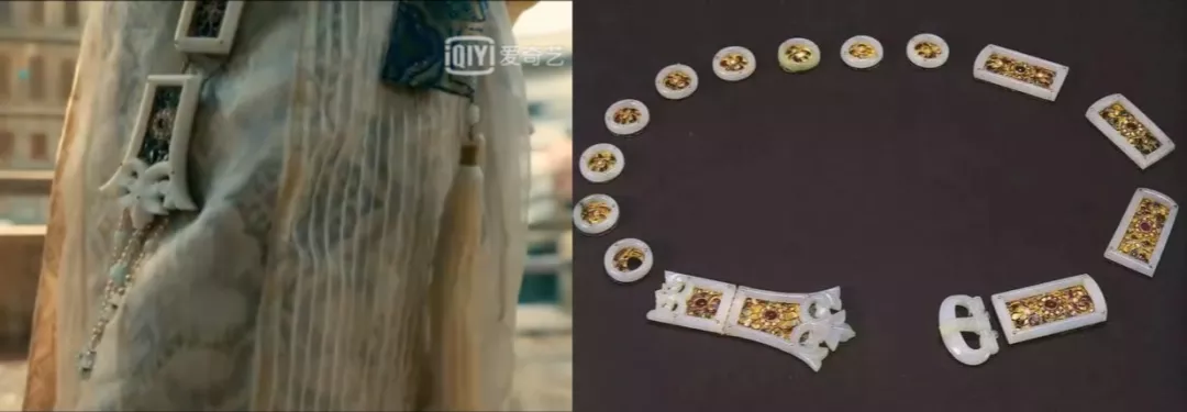 那邊廂,百里弘毅出場時所佩戴的腰帶叫蹀躞(diexie)帶,其原型是出土於陝西長安縣南里王村唐竇皦墓的玉梁金筐寶鈿真珠碟躞帶,現收藏於陝西省考古研究所。