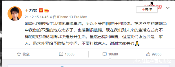12月15日,王力宏通過微博發聲,確認自己已提出離婚申請。王力宏稱自己私生活很簡單很單純,懇求外界給予隱私與空間,不要打擾家人。