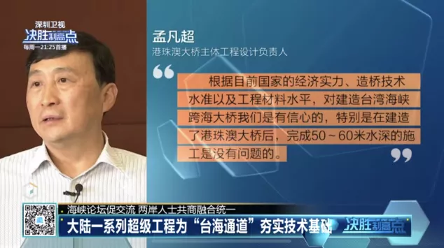 深圳衞視《決勝制高點》特別採訪同濟大學教授、國際橋樑與結構工程協會主席葛耀君,清華大學台灣研究院常務副院長巫永平,廈門大學兩岸關係和平發展協同創新中心主任劉國深,台灣時事評論員黎建南帶來全方位解讀,並邀請北京語言大學國別和區域研究院學術院長黃靖,中國人民大學教授時殷弘,澳門理工學院名譽教授邵宗海深入探討推進“台海通道”的現實意義。