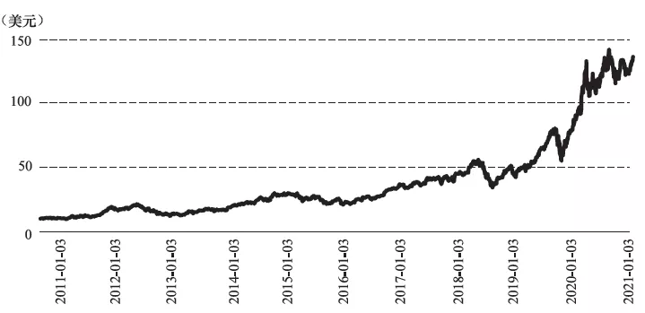 在高科技尤其是硬核科技領域屢見不鮮,對投資人的專業判斷提出了挑戰,蘋果在經歷了2000年科技股泡沫以及多年低迷以後,喬布斯的迴歸使得公司重新獲得了研發的靈魂,並在2007年1月9日成功推出iPhone,從而改變了手機市場的格局,股價也重新獲得了上漲的動力,蘋果股價從2011年3月9日的7.35美元,到2021年3月9日收盤價121美元,十年漲幅達到15.5倍,最高價為144.88美元,十年間股價最高價翻了19.7倍。