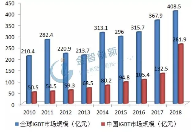 從上圖看出2010年時,全球IGBT市場規模為210.4億元,我國僅有50.5億元,但在2018年時,全球IGBT規模為408.5億元,而我國已經達到261.9億元,中國市場規模同期增速為18.2%。