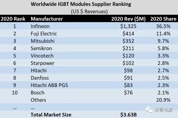 排名前十的公司分別為英飛凌(市場佔比36.5%)、富士電機(市場佔比11.4%)、三菱電機(市場佔比9.7%)、Semikron(市場佔比5.8%)、Vincotech(三菱電機控股,市場佔比3.3%)、斯達半導體(市場佔比2.8%)、日立(市場佔比2.7%)、Danfoss(市場佔比2.5%)、ABB(市場佔比2.3%)、Bosch(市場佔比2.1%),我國IGBT的發展進程雖然不如國外,但我國的IGBT市場還是有很大前景。