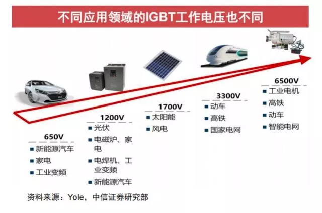 一般低壓IGBT常用於變頻白電、新能源汽車零部件等領域;中壓IGBT常用於工業控制、新能源汽車等領域;高壓IGBT常用於軌道交通、電網等領域。