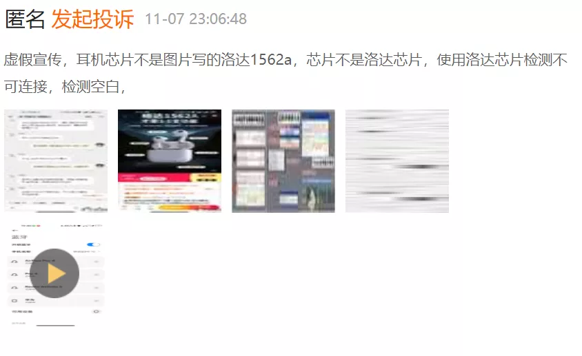 如廣泛使用絡達(17年被聯發科收購)1562A芯片的TWS耳機,具備ANC主動降噪,而根據黑貓投訴帖,不少買家經檢測發現,產品承諾的絡達1562A芯片壓根是騙人的,要麼實際檢測為恆玄2300芯片,要麼檢測絡達為不可連接,為空白參數。