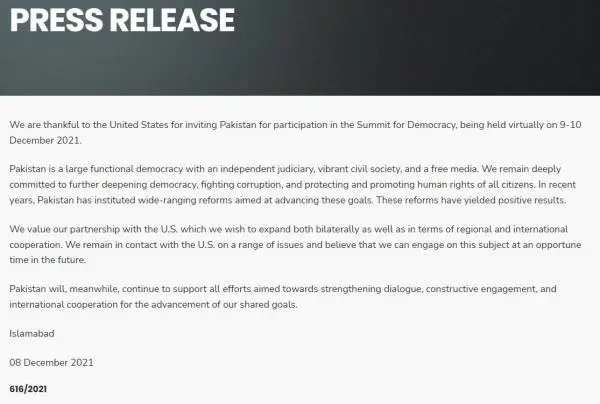 在聲明中,巴基斯坦方面首先是感謝美國的邀請,然後闡述了自身在民主建設方面所取得的成果,強調自己擁有獨立的司法機構、充滿活力的公民社會,以及自由的媒體。聲明還提到將進一步深化民主、打擊腐敗、保障公民人權。此外,巴基斯坦還強調了對巴美關係、地區形勢非常重視,並且希望跟美國進一步加強對話、合作。