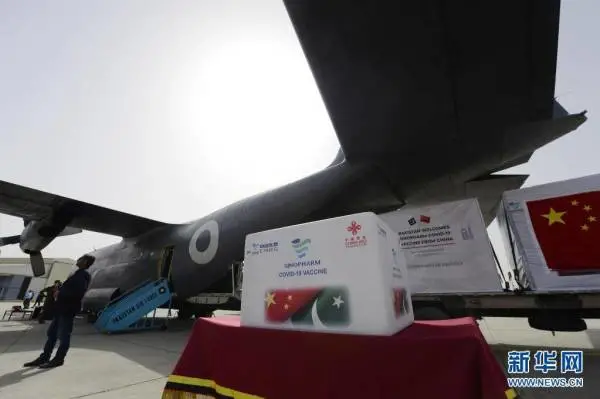 2021年3月17日,中國政府援助巴基斯坦第二批新冠疫苗交接儀式在巴首都伊斯蘭堡附近的努爾汗空軍基地舉行。圖源:新華社(艾哈邁德·卡邁勒攝)