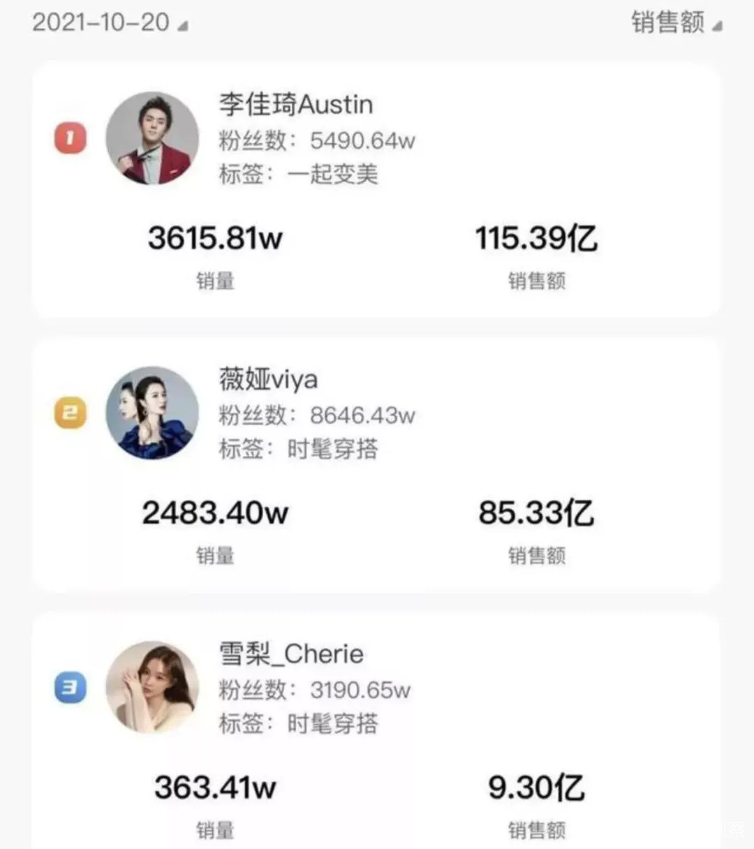 比如今年雙11首場預售直播,李佳琦銷售額達115.39億元,薇婭85.33億元,雪梨以9.3億元排在第三,與前兩者差距將近10倍。