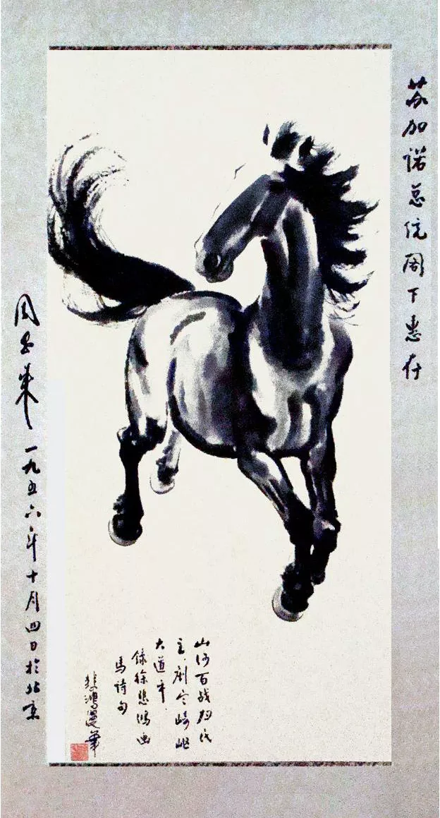 父親的報告得到重視,毛主席於1956年4月21日簽署了給蘇加諾的訪華邀請書。蘇加諾如願以償得到毛主席簽名的齊白石絕筆《富貴長青》及周總理簽名的徐悲鴻《奔馬》立軸,收入《藏畫集》第三集。