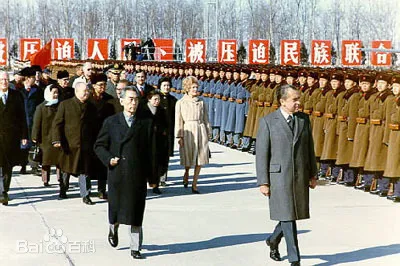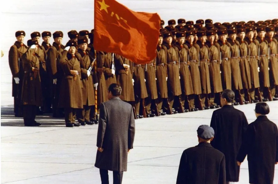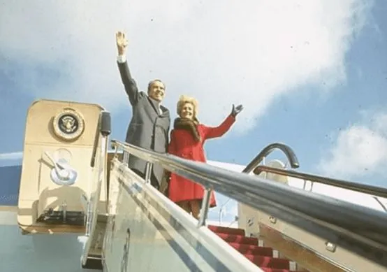 2月21日上午11時30分,尼克松總統乘坐的“空軍一號”專機抵達北京首都機場,受到了周恩來總理、葉劍英元帥、李先念副總理和郭沫若副委員長等領導人的歡迎。這個場面使人想起1954年的日內瓦會議期間,美國人不同周恩來率領的中國代表團握手的傲慢無禮的行為。似乎是為了糾正這一錯誤,尼克松走下飛機時,特意安排在他同周恩來握手前,讓隨行人員暫緩下機。