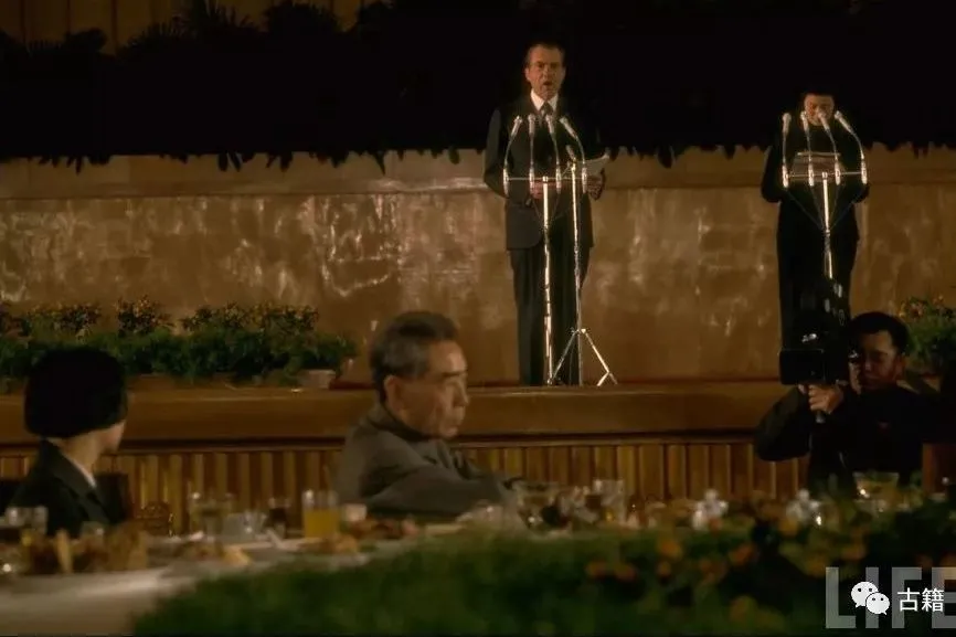 周恩來總理首先代表毛澤東主席和中國政府向尼克松總統和夫人,以及其他的美國客人們表示歡迎。