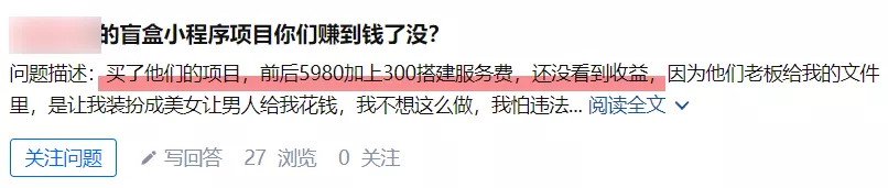 另外,根據知乎上的爆料,有知乎用户買盲盒小程序項目,前後花費了 5980 在加 300 搭建服務費 ↓ ↓