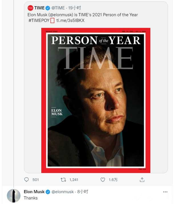 在成為《時代》週刊2021年度風雲人物後,馬斯克轉發了《時代》週刊相關推文並寫下評論“謝謝”