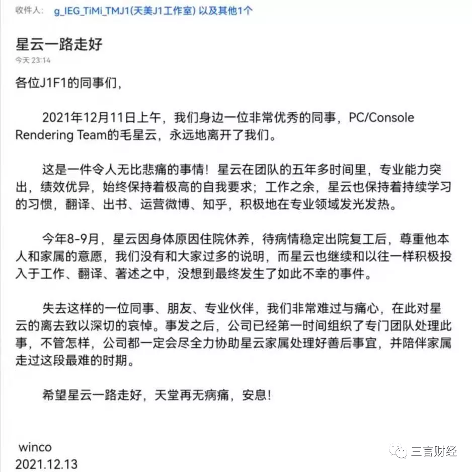 騰訊也在內部郵件中表示,“失去這樣一位同事、朋友、專業夥伴,我們非常難過與痛心,在此對星雲的離去致以深切的哀悼”。