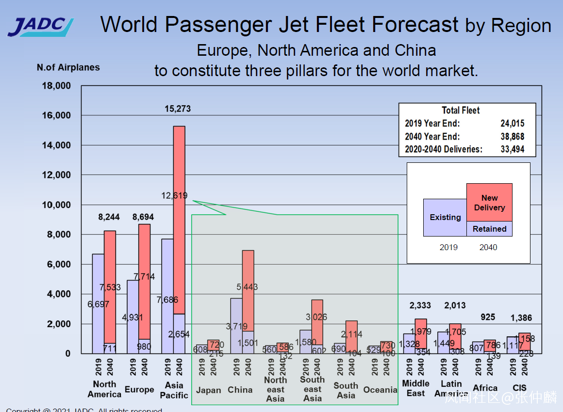 波音和商飛的預測國內機隊數量基本差不大多,9600架。區別無非是對北美市場的看法,波音認為北美機隊規模還是比中國大一點,而商飛認為中國比北美多一點。中航工業預測的數據是僅中國內地不包含港澳台,所以數據偏少,如果加入港澳台的話估計預測規模和其他幾家差不多,在9500-10000的範圍。而日本JADC的預測無疑就離了大譜,和其他預測偏差過大了,6944架只能認為是日本人故意算了個少的數字,不願意面對中國將成為世界最大航空市場的現實。