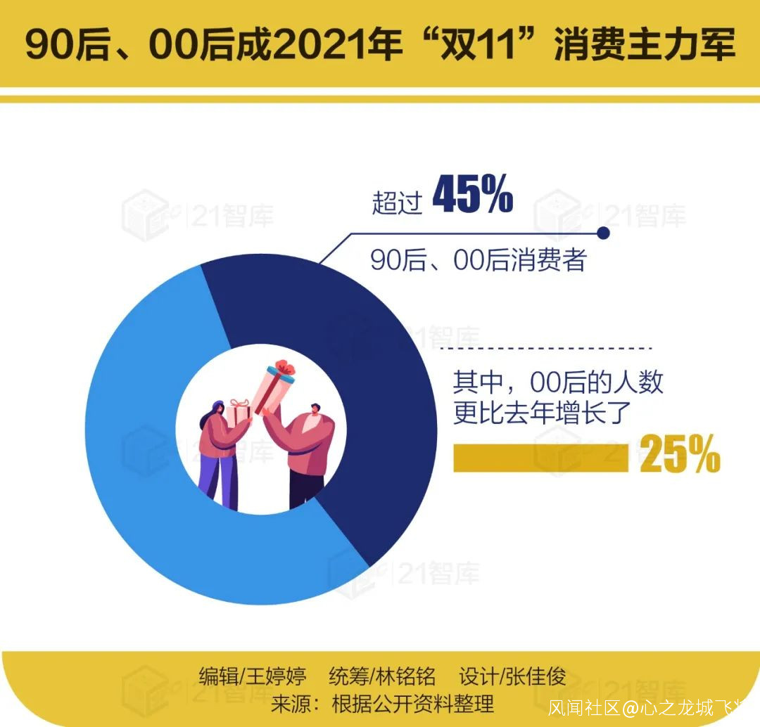 從各大平台反饋的數據來看,今年“雙十一”期間,90後、00後消費者佔比已經超過45%;當中,00後的人數更比去年增長了25%。