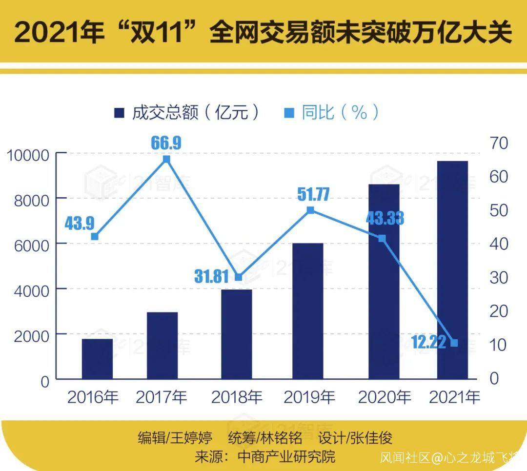 對比之下,今年“雙11”的關鍵詞之一卻換成了年輕人的興趣寥寥,更遑論“雙12”了。中商產業研究院數據顯示,2021年“雙11”全網交易額為9651.2億元,同比增長12.22%,未突破萬億大關。