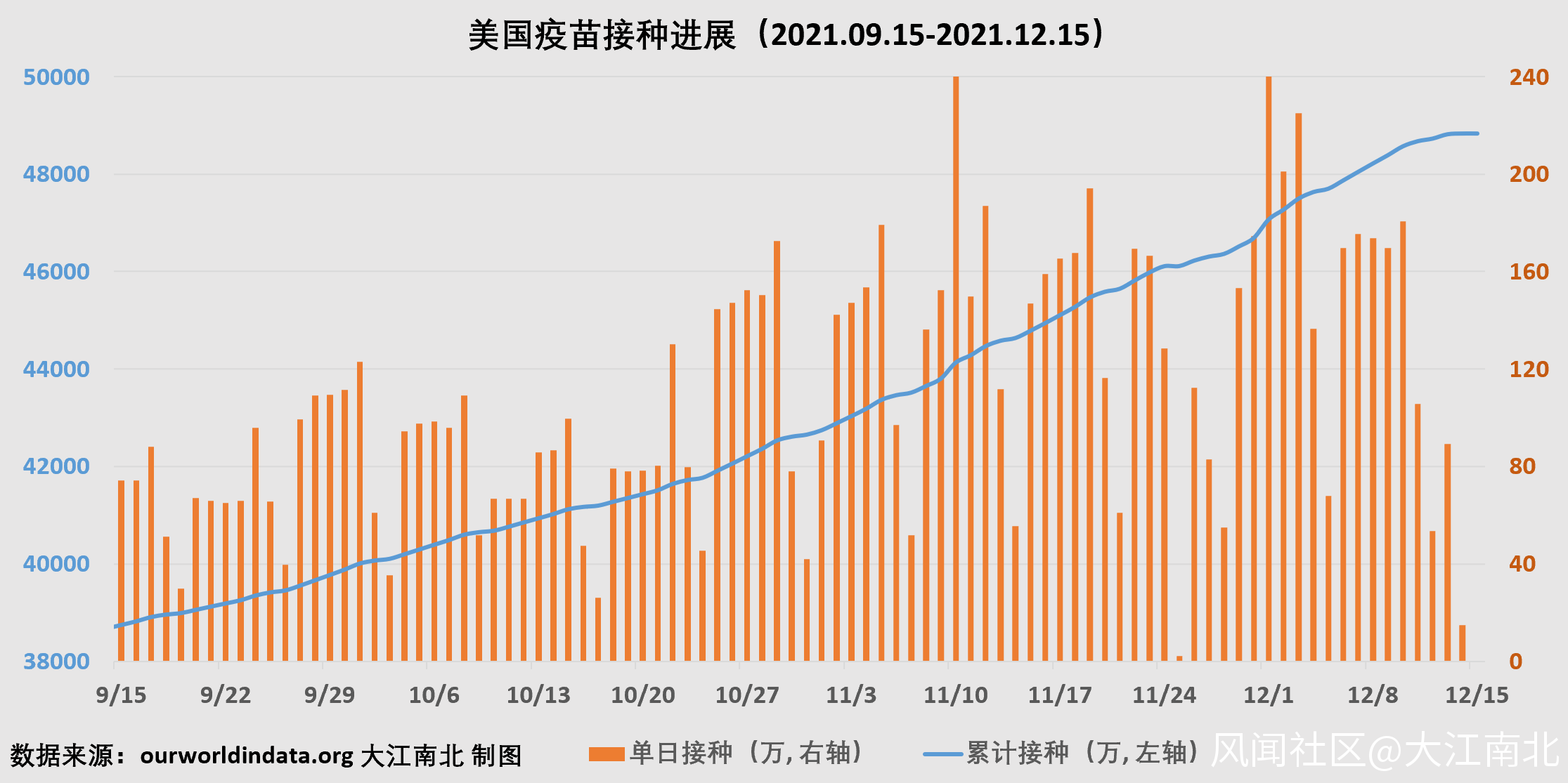 截止2021年12月15日,美國累計接種4.8830億劑,居全球第三位;美國每百人累計接種145.18劑,比中國低41.82劑,是中國的77.6%。