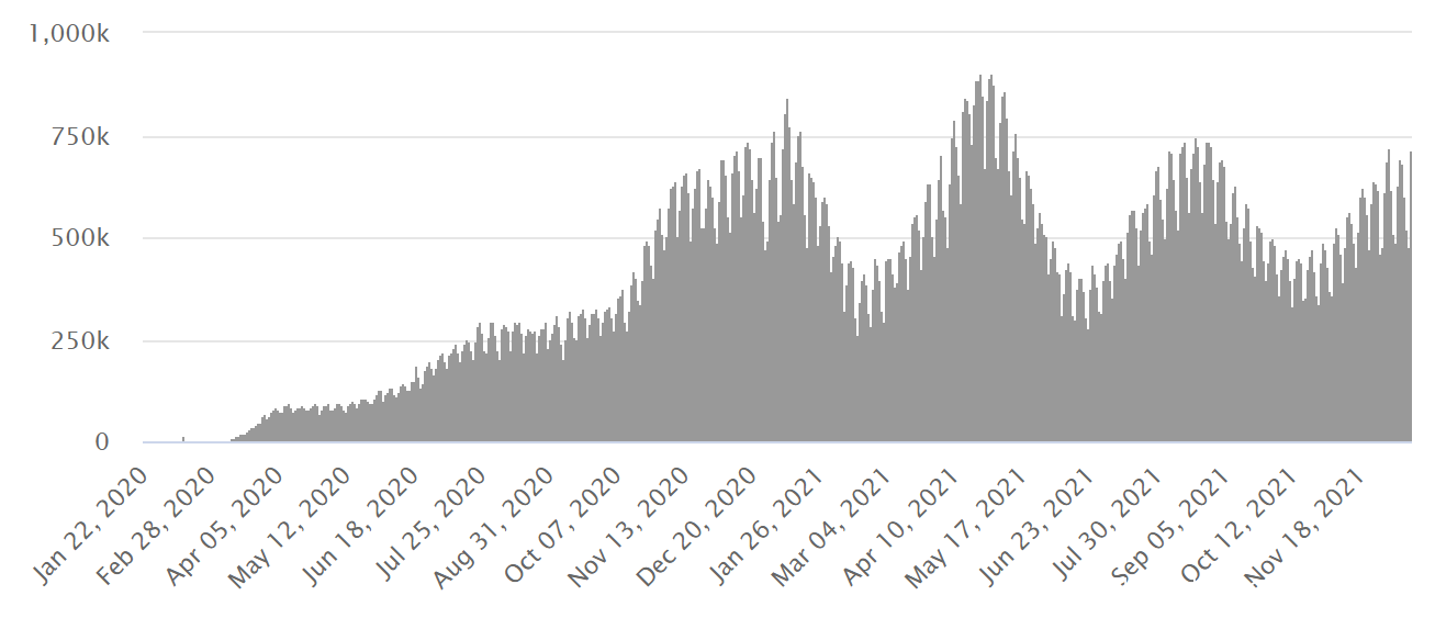 全球單日新增確診病例(2020.01.22-2021.12.15**)**